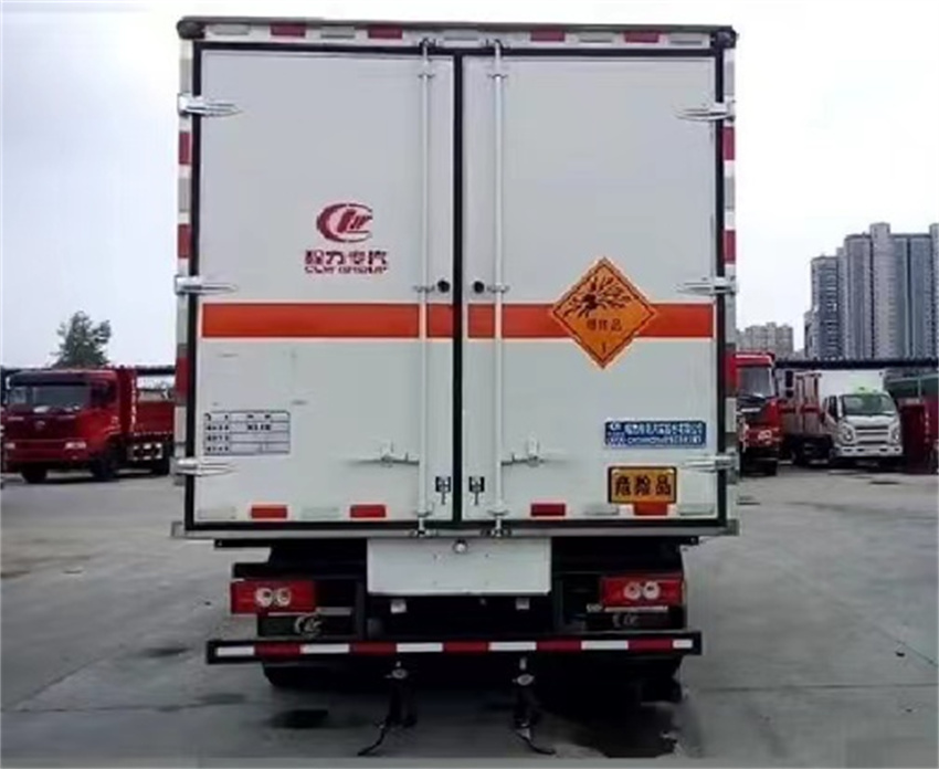 右開單側門,廂體為雙層金屬骨架結構,外冷軋鋼板內飾鋁板,內壁采用鋁合金板蒙面,夾層為隔熱阻燃材料填充,廂體內部做通風窗口,廂體內部做防靜電處理,廂體底部鋪導靜電膠板,車輛副梁配備導靜電帶,廂體內襯壁裝單排臥環,廂體內頂部安裝氣體報警器,廂體安裝防盜報警器,隨車配備手提滅火器,危險品三角頂燈,防護帽等