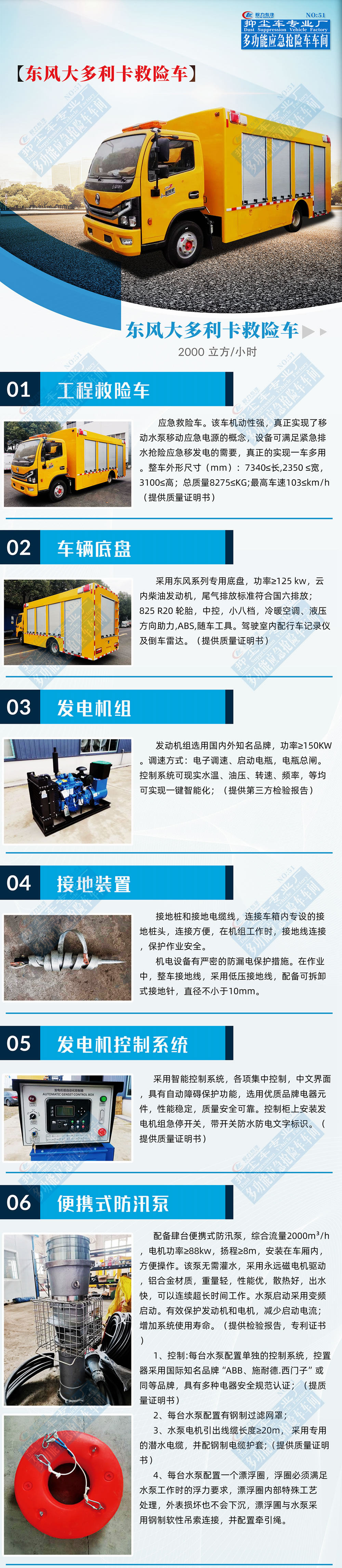 工程救險車配柴油發電機組、移動水泵、控制系統等,可滿足深水區域搶險救援工作,保障城市防汛排水通暢,提高防汛排澇能力,確保汛期群眾生命財產安全和城市道路正常運轉,真正實現了移動水泵的概念,廣泛適用于城市消防領域,排澇、抗旱、礦井搶險、森林消防、高速公路橋梁底涵排水、灌溉等領域。常見應用于無固定泵站,無電源地區排水,城市道路、公路、地鐵隧道排水,消防應急供水防洪搶險,淹沒地區排水,江河湖泊、水庫、海洋水環境治理,農業應急抗旱供水、臨時調水,地下水管爆裂,企業工廠排水排污,特別適用于城市內澇排水搶險。