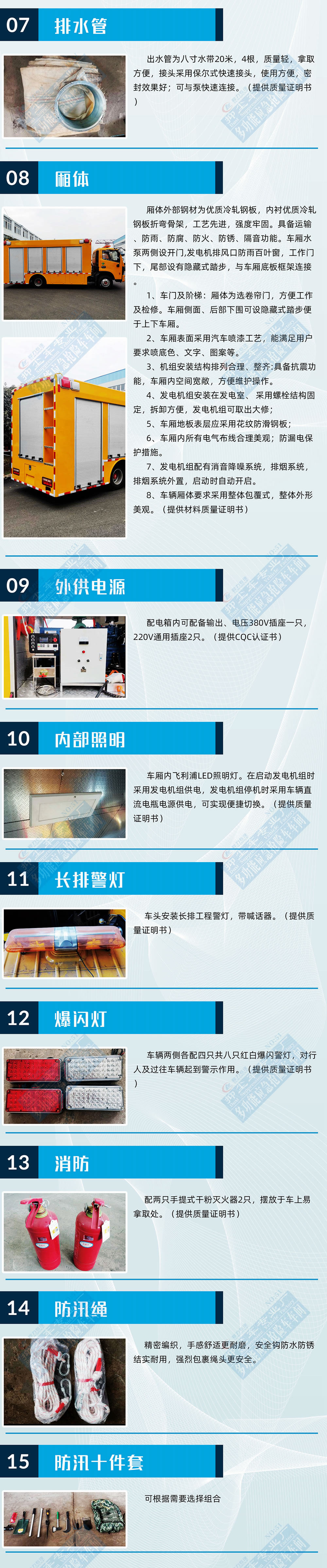 選裝配置:選裝行李架、爬梯、車頂工作臺;選裝不同形狀、結構的警示燈;選裝中隔斷(可選擇開門)、車身兩側可選開上掀門、盲窗、側開門;花紋鋁板;加裝設備工具柜、配電箱、發電機組、水泵、電焊機、空壓機等線路安裝外接電源系統、(室內燈光照明、探照燈、高桿照明燈等);繞線盤,還可根據用戶不同需求加裝不同的維修搶險設備、車身制作專用圖案或標識。