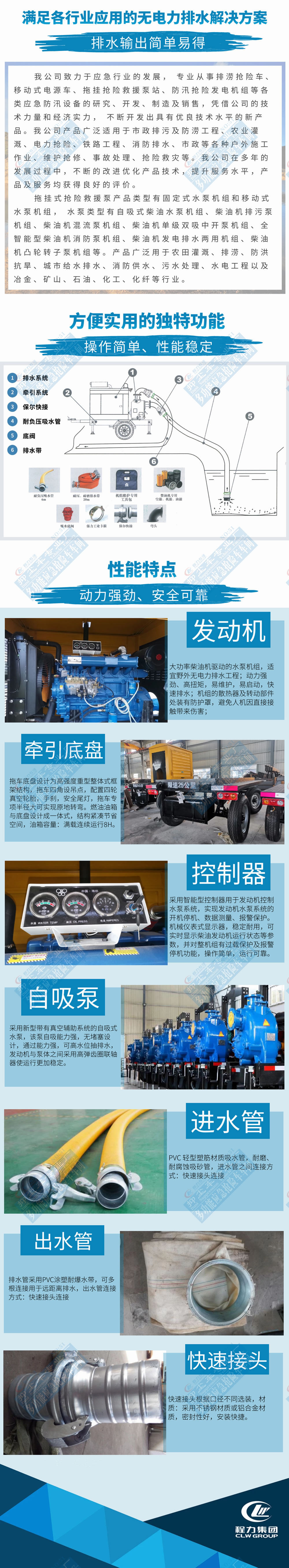 移動性好:移動拖車式,隨時隨地出發,可快速到達工作現場。機動性強,能滿足低洼片移動排水需要。